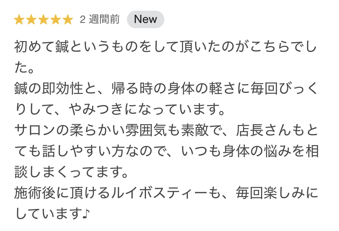 当サロンにご来院いただいたお客さまから、うれしいお声をいただいております。Google口コミやInstagramなどで実際にいただいたご感想をご紹介します。鍼灸が初めての方にも、参考になれば幸いです。
